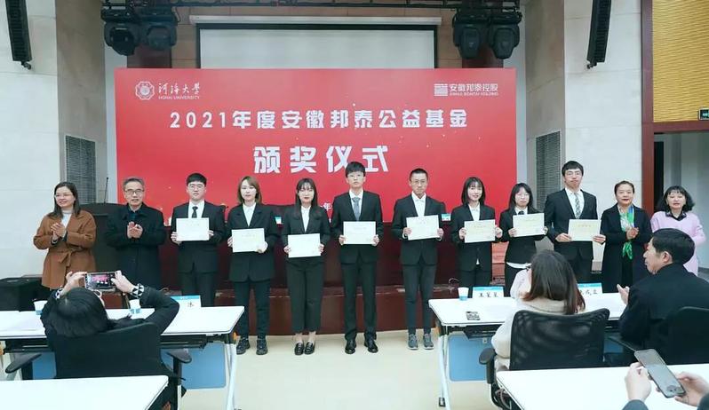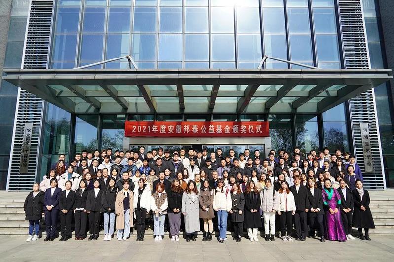 11月24日,我校举行2021年度安徽邦泰公益基金颁奖仪式。校党委副书记郭继超、安徽邦泰控股集团副总裁金永春出席本次颁奖仪式。