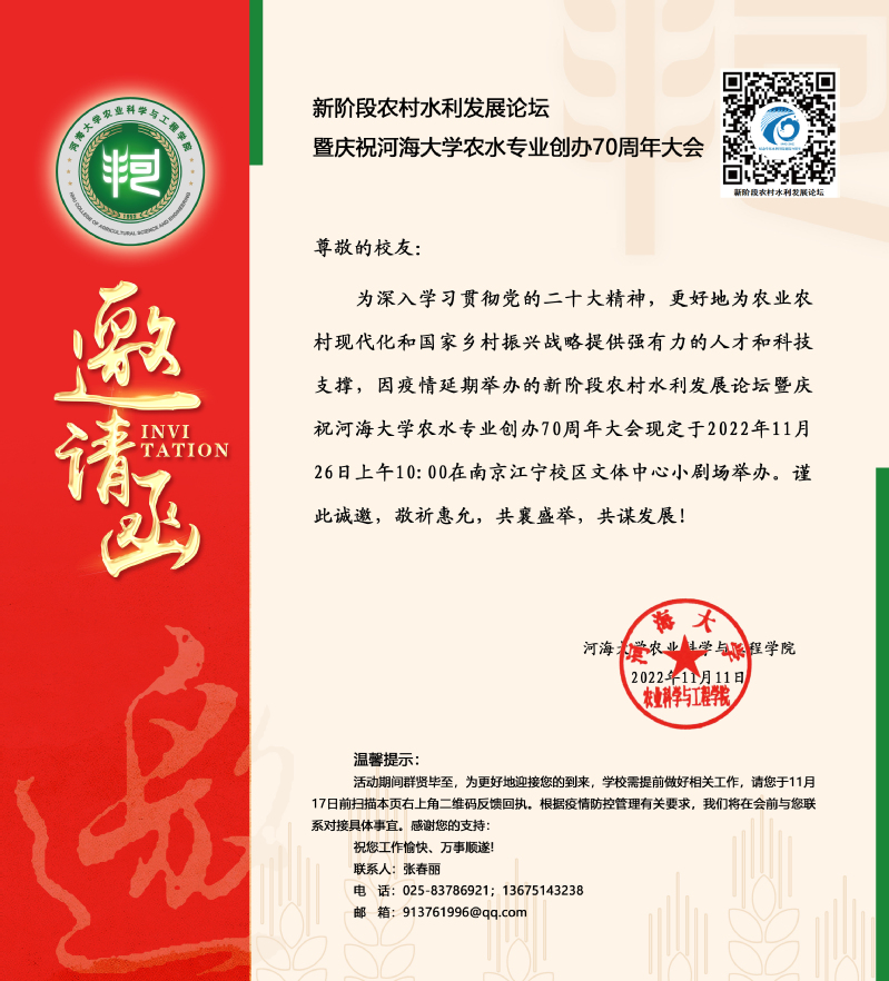新阶段农村水利发展论坛暨庆祝河海大学农水专业创办70周年大会邀请函