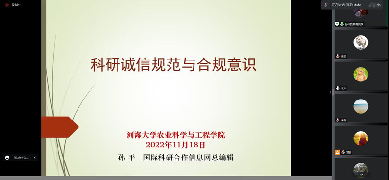 为加强科研诚信建设,加大科研诚信、学术规范的宣传教育力度,营造良好学术道德氛围,2022年11月18日下午,伟德国际1946bv官网在江宁校区行政楼401室举办“学术规范和学术诚信”讲座,邀请国际科研合作信息网总编辑孙平博士为农工院全体师生作题为“科研诚信规范与合规意识”的报告,讲座由副院长徐俊增教授主持,采用线下与线上相结合的方式进行。