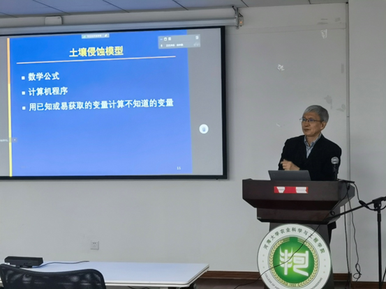 报告会上,刘宝元教授从“为什么要关心土壤侵蚀”入题,分析了土壤侵蚀的多方影响,引出模型是有限的数据解决无限的问题重要手段。随后,刘宝元教授带领在座师生回顾了USLE(通用土壤流失方程)模型构建的过程,并结合自己在美国普渡大学农业部国家土壤侵蚀实验室参与WEPP(水蚀预测项目)模型研发的亲身经历,分享了他在土壤侵蚀模型构建与实际应用中的独特见解与丰富经验。报告的高潮部分,刘宝元教授详细阐述了他归国后如何结合中国特有的侵蚀环境,开发的CSLE(中国土壤流失方程)模型的历程。报告内容丰富、深入浅出、充满研究性,其开阔的视野、严谨的思路、儒雅的风采让与会师生印象深刻。