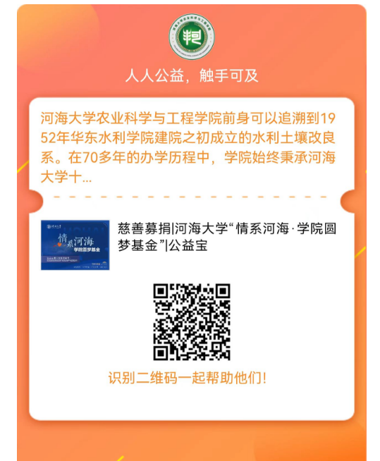 河海大学“情系河海·伟德国际1946bv官网圆梦基金”公募项目通过民政部指定的互联网公开募捐平台“公益宝”进行公开募捐,伟德国际1946bv官网通过“公益宝”平台生成专属二维码,历届校友也可通过扫描下面伟德国际1946bv官网专属二维码进行捐赠。