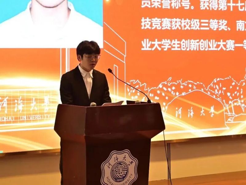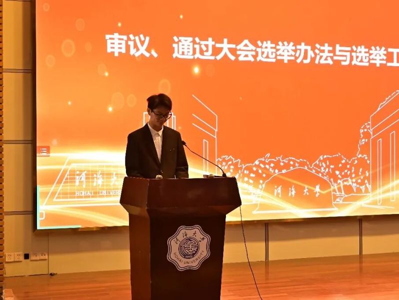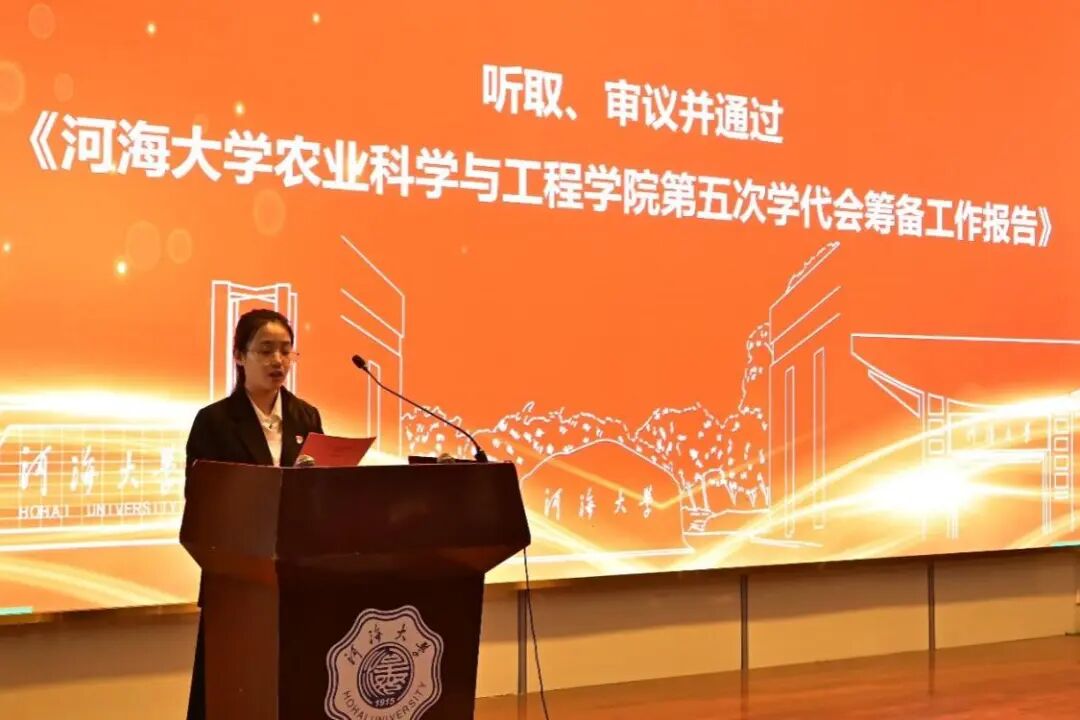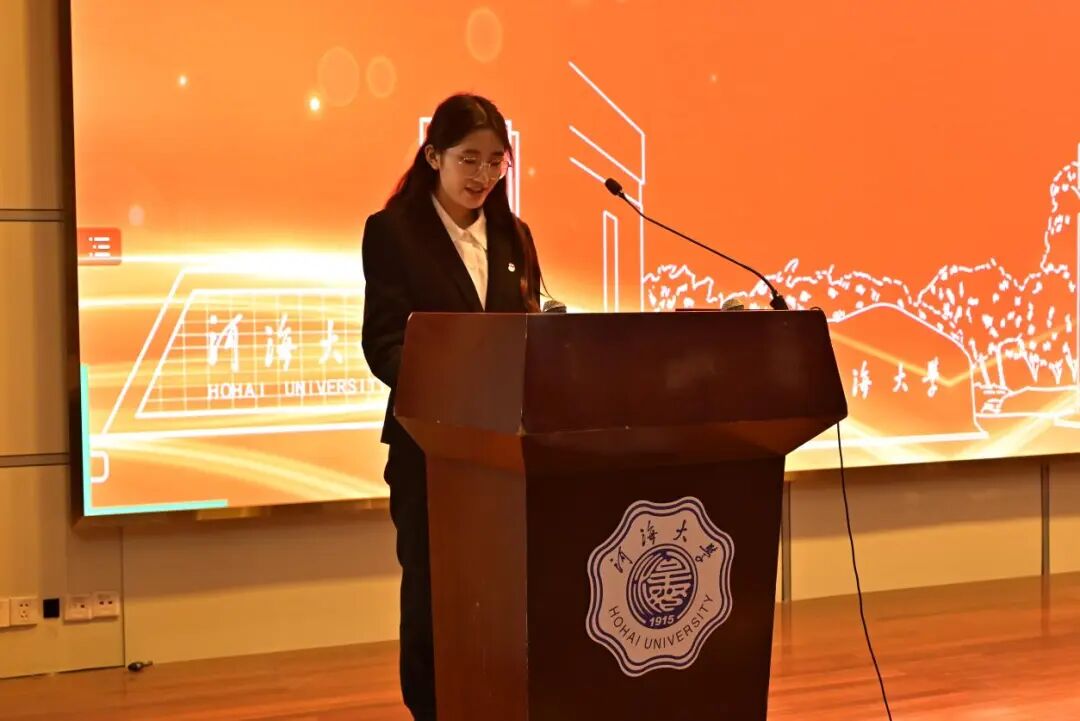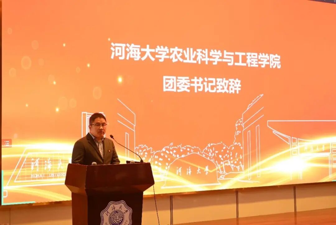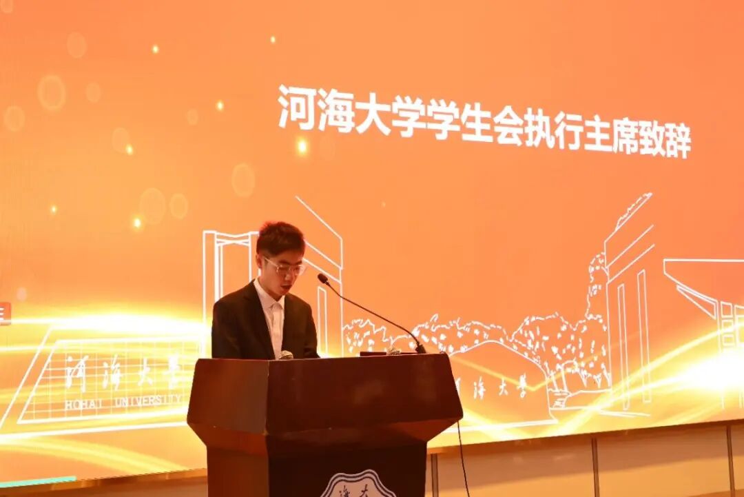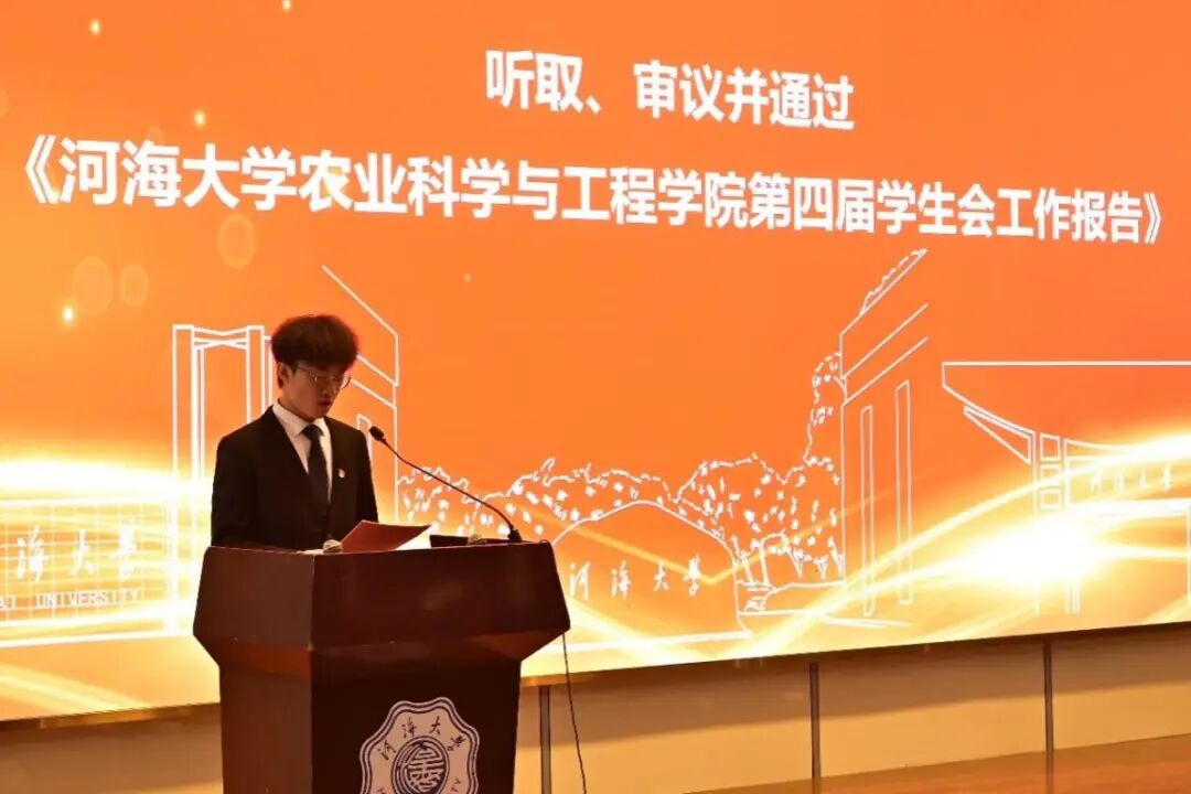 河海大学学生会执行主席孙昊为大会致辞,他代表河海大学学生会对大会的顺利召开表示热烈的祝贺,并对农工院学生会过去一年的各项工作表示充分的肯定。他向农工院学生会提出了坚守思想灯塔、把握政治航道,心怀同学福祉、担当桥梁使命,革新组织结构、严守治会纪律的三点期待,希望农工院学生会能够秉承“ 全心全意为同学服务” 的宗旨,继续发挥桥梁与纽带作用,努力开创农工院学生会工作新局面。