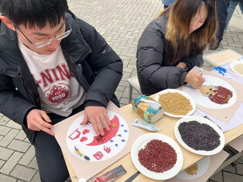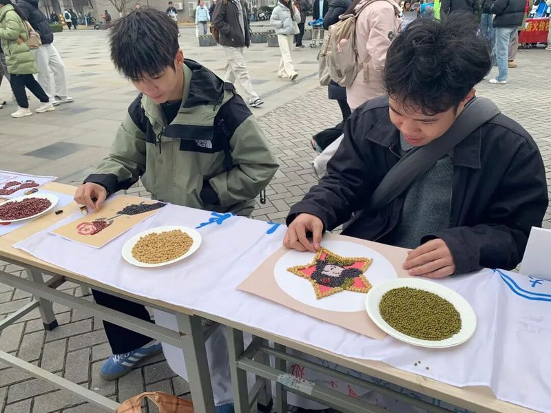 在志愿者的互动宣传下,活动现场吸引了众多师生热情参与,他们用五谷作画,有人以红豆、绿豆为“颜料”,在画布上勾勒出雷锋同志的生动肖像;有人用小米、黑米拼出“奉献、友爱、互助、进步”的志愿标语;更有参与者巧妙结合稻谷与麦粒,创作出象征丰收与节约的创意作品。一幅幅质朴却充满心意的作品,画出他们对雷锋精神的理解,凝聚着青年学子对雷锋精神的深刻认同。活动尾声,志愿者们合影留念,镜头中一张张青春洋溢的笑脸,映照出新时代青年对志愿服务的热情与担当。