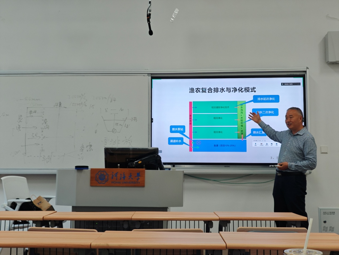 5月23日下午,伟德国际1946bv官网郭相平教授在常州校区作题为《稻田氮磷净零排放的渔农复合系统》的专题讲座,吸引了众多师生参与。讲座聚焦“蓝色粮仓科技创新”项目中的渔农复合系统研究,探讨如何通过鱼塘与稻田的协同作用实现农业绿色转型。
