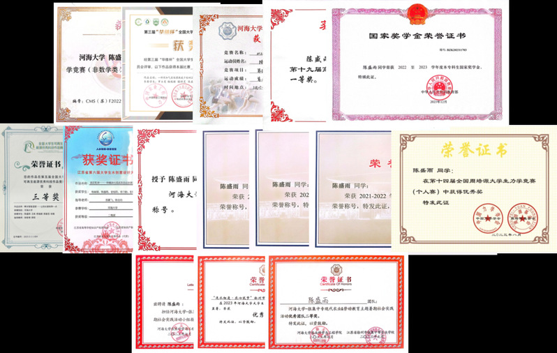 “知者行之始,行者知之成。”作为一名秉承治水禹志的水之子,陈盛雨深知要将知识的力量化为实践的产物,将“坐而论道”转化为“起而行之”。在创新实践的过程中,他聚焦水利工程与人工智能结合的热点问题,矢志为水利强国建设贡献力量。为此,他团结同学,花费大量的时间深入学习数学物理模型和计算机编程,积极参与大学生创新训练计划、数学建模竞赛与创新设计大赛。两年来,他荣获2023年美国大学生数学建模竞赛H奖、第三届“华维杯”全国大学生农业水利工程及相关专业创新设计大赛二等奖等十余项国省级竞赛奖项。